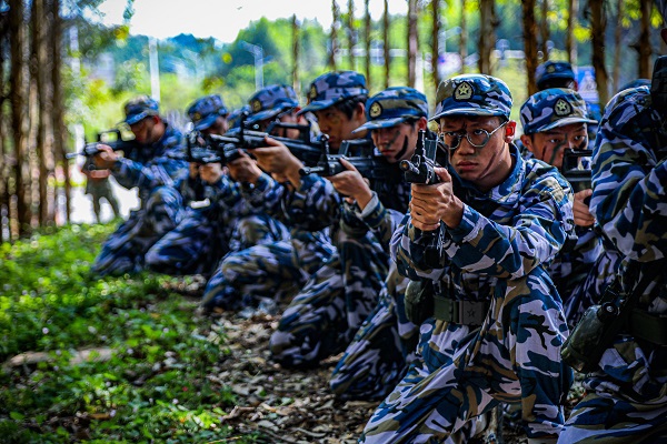 随着行军拉练开拔的号令声,76支军训中队在教官的带领下,精神抖擞地踏上了野外拉练的征程。为增强拉练效果,现场模拟真实战场环境,设置了穿越烟雾地带、障碍地带、染毒地带和空袭地带等军事关卡,让学生在实践中感受军人的艰辛与荣耀,增强学生的国防观念和强军意识。