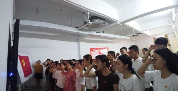 最后,在陈卉老师领誓下,全体预备党员举起自己的右手,面对鲜红的党旗大声说出自己的入党誓词。