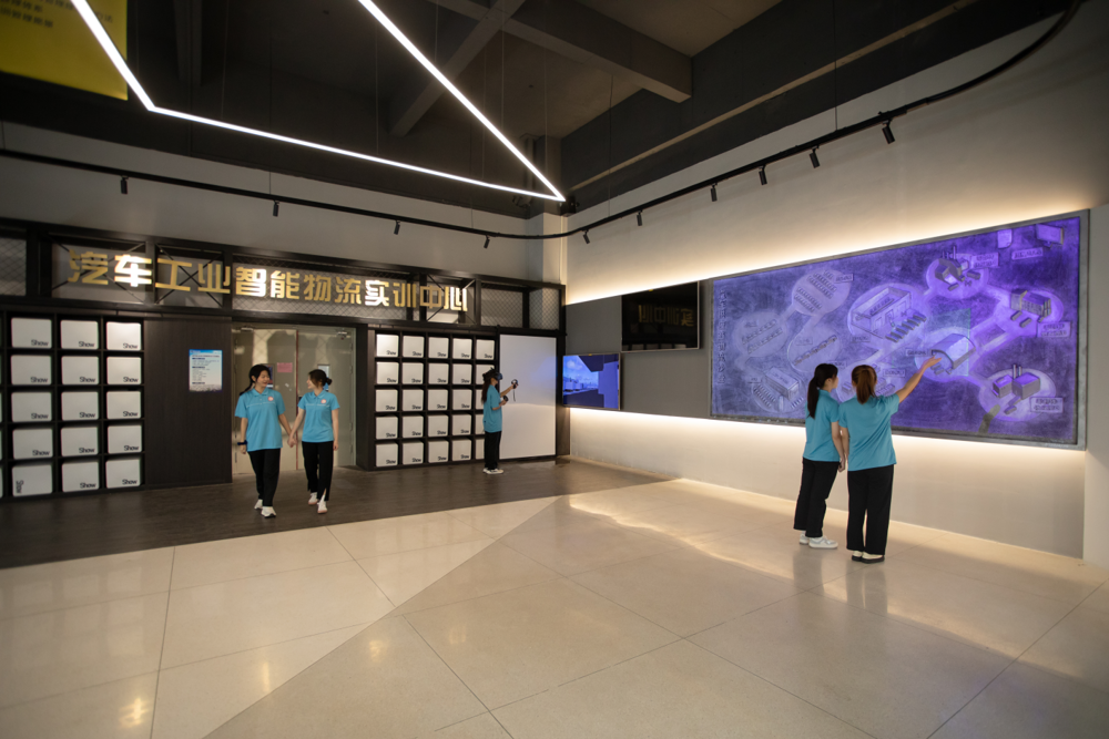 汽车工业智能物流实训基地,自治区职业教育示范特色专业及实训基地,占地面积约2500平方米,包括汽车零部件集配作业综合实训中心、储配实训中心、包装实训中心、AR/VR实训中心、跨境电商实训中心等,可开展汽车零部件窗口接收、出入库、货到人拣选、SPS配送、排序配送、拉动配送等全流程厂内物流项目实训。