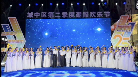 新闻网消息(文/艺术学院 胡耀华 图/艺术学院 朱学春)2025年5月1日晚,柳州市城中区第二季度潮酷欢乐节活动晚会在柳州五星步行街精彩上演。艺术学院音乐教育专业40名学生在胡耀华、朱学春2位老师的带领下,用精彩的合唱和饱满的艺术表现,与其他9个节目一同为现场的观众呈现了精彩纷呈的文化视觉盛宴。