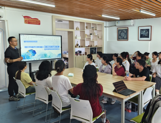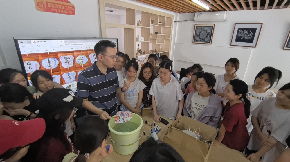 在活动开始前,艺术学院分团委书记韦益良希望同学们将千年漆艺化作点缀生活的画笔,暂别喧嚣,执扇为纸、流漆成诗,在传统技艺中寻得内心的宁静,让非遗之美浸润青春时光。艺术学院学生党支部教师孙展航则对漆扇的历史渊源、文化与艺术价值作了简要介绍,并进行制作示范。
