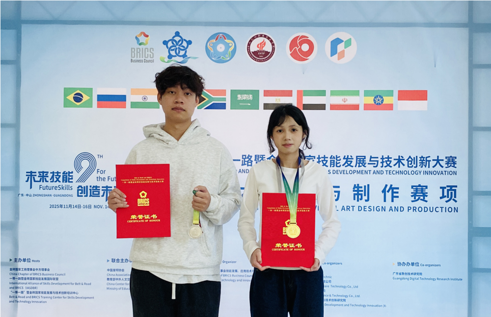(新闻网消息 文、图/艺术学院 刘强)2025年11月14日至16日,由金砖国家工商理事会中方理事会、“一带一路”暨金砖国家技能发展国际联盟、“一带一路”暨金砖国家技能发展与技术创新培训中心主办的2025年“一带一路”暨金砖国家技能发展与技术创新大赛视觉艺术设计与制作赛项在中山火炬职业技术学院隆重举行。经过来自全国150多支队伍的激烈角逐,由米乐官网艺术学院派出的两支队伍稳定发挥,分别荣获了一等奖与二等奖的好成绩!再次为学校赢得了荣誉。