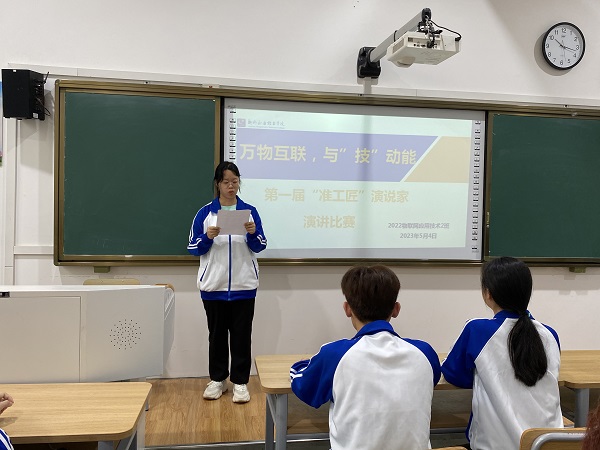 新闻网消息(文/电子信息工程学院 钟舒娴 图/电子信息工程学院 梁德强)近年来,物联网技术的快速发展,已经使得“万物互联”成为了一个广为人知的词汇。在这个数字化和智能化的时代,物联网技术已经在各行各业得到广泛应用,促进了社会经济的发展和人们生活的便利。一方面为了让同学们更快的对物联网技术专业有一个更深的认知,另一方面为了培养和激发学生的工匠精神和演讲技能,提高他们的语言表达能力、思维逻辑能力,使他们更好地适应未来的职业需求。2023年5月4日2022物联网应用技术2班在T1A205开展了以“万物互联,与“技”动能“为主题的”准工匠”演说家活动。