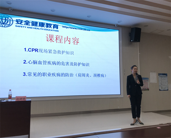 主讲教师通过讲、演、练结合的授课方式,系统生动传授了心肺复苏术知识和操作、心脑血管疾病预防和急救、颈椎方面职业病的预防和保健共三个方面内容,讲座过程中,教师们认真聆听,热情参与,现场气氛活跃轻松。