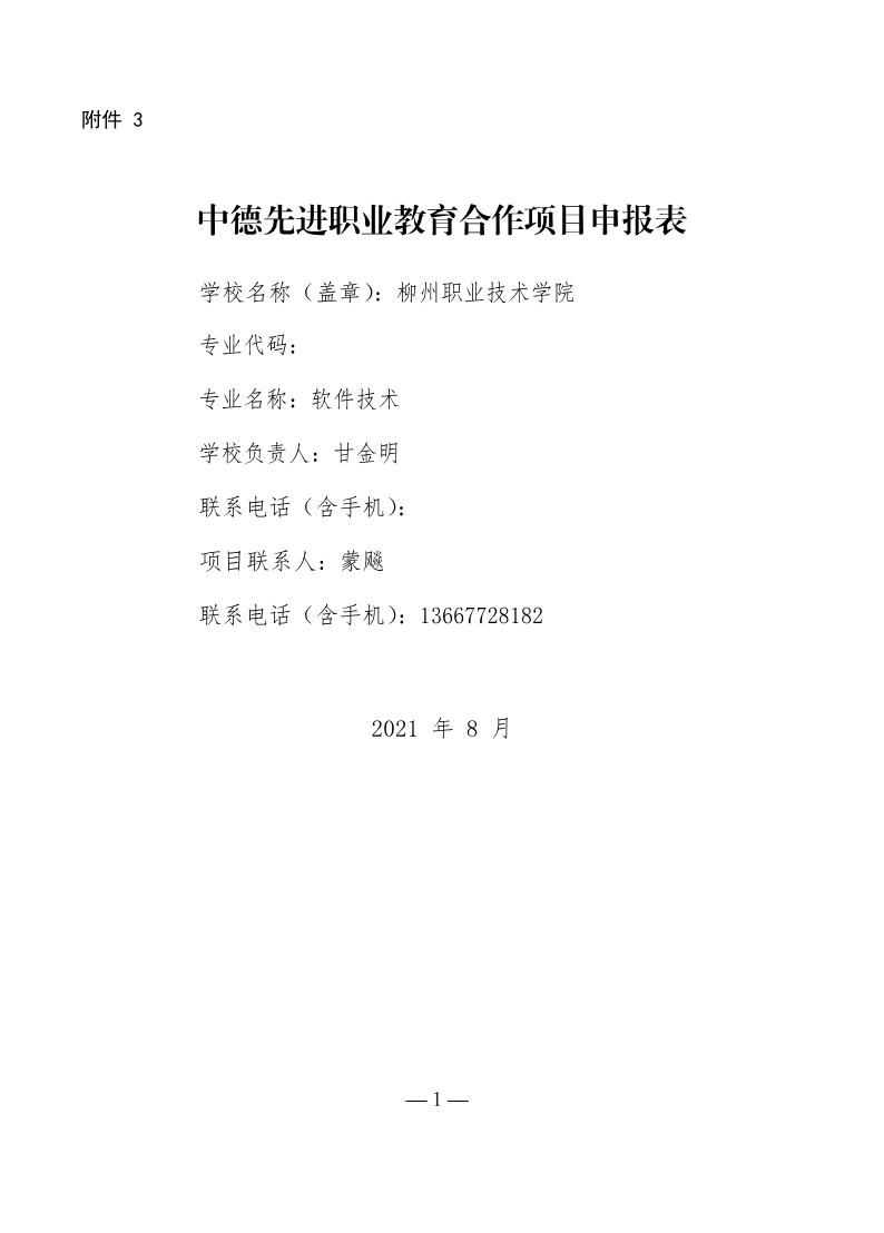 申报表1:中德先进职业教育合作项目申报表(柳职院-软件技术)