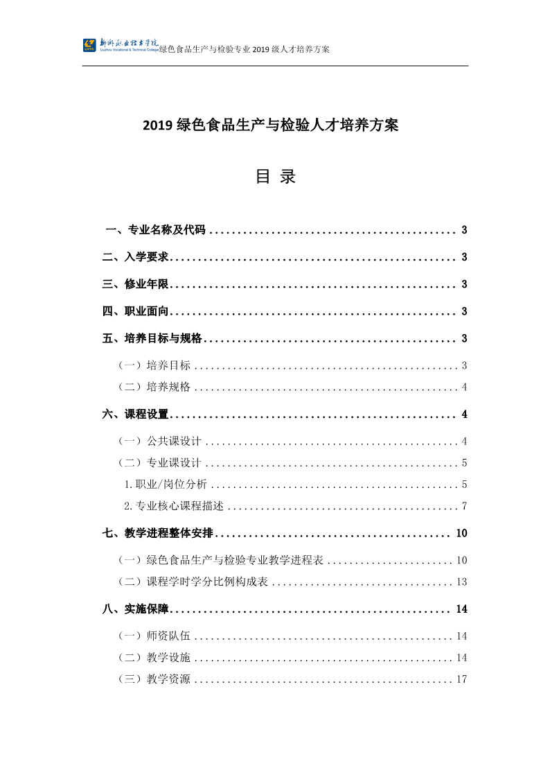 2019级绿色食品生产与检验专业人才培养方案