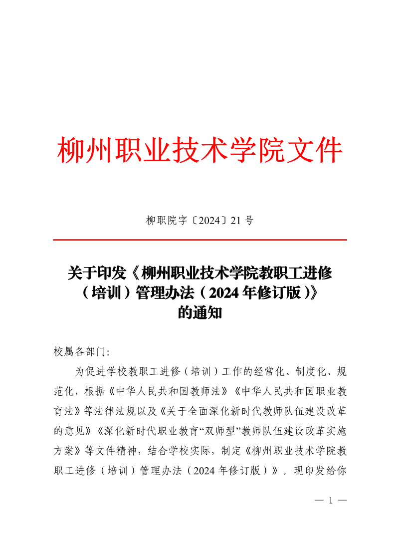 柳职院字〔2024〕21号 关于印发《柳州职业技术学院教职工进修(培训)管理办法(2024年修订版)》的通知 来源: 发布时间:2024-05-16 10:46:31 浏览次数: 次 【字体:小 大】 终审:教职工发展中心 分享到: 【打印正文】