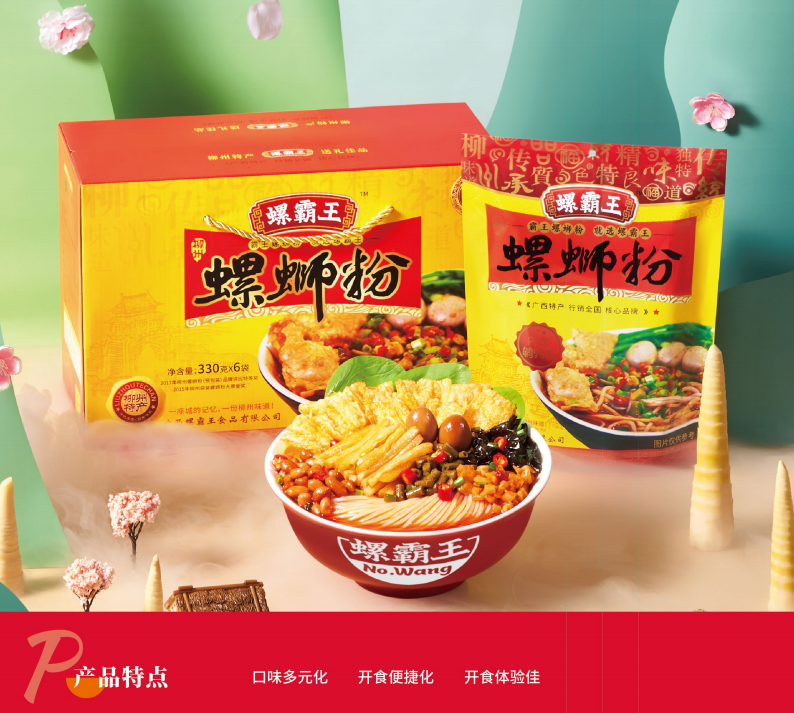 二产:螺霸王产业园是柳州第一条智能化、自动化、可视化、集工业观光旅游的全透明数字化螺蛳粉工厂,一二期投产后公司日产能最高可达150万袋。目前产业园安排近千名员工就业。产业园的螺蛳粉文化体验之旅已成为柳州形象窗口,每天接待六七百游客参观。