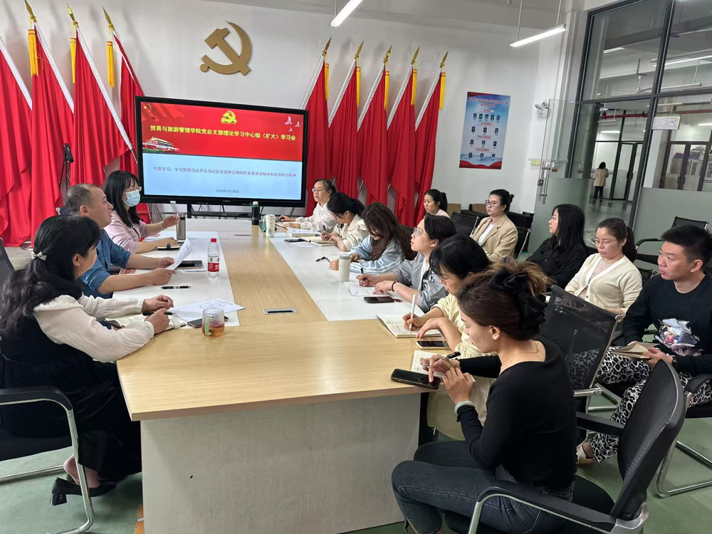 新闻网消息(文/贸易与旅游管理学院 陈卉 图/贸易与旅游管理学院 徐娟)2025年3月26日,贸易与旅游管理学院党总支在崇文楼514召开理论学习中心组(扩大)学习会,专题学习习近平总书记在全国两会期间的重要讲话精神和全国两会精神。会议由党总支书记陈月明主持,全体党务工作者参加会议。