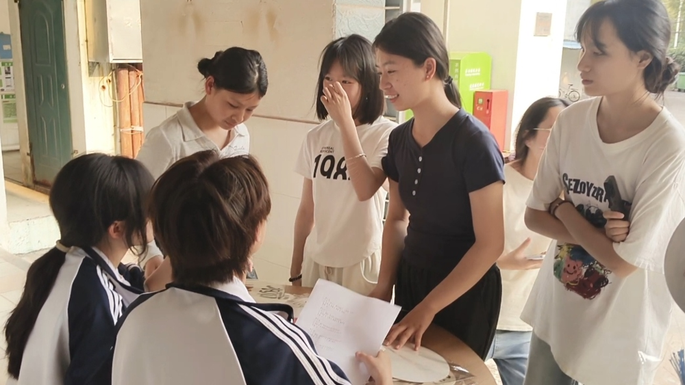 活动现场划分为四大主题区域,民族知识抢答区率先掀起热潮。参与者需在5秒内快速作答与"三月三"相关的习俗问题,答对3题即可获得通关奖励。伴随着此起彼伏的欢呼声,工作人员现场核对答案并颁发奖品,30余名同学成功通关。民族美食体验区陈列着五色糯米饭,天然植物染制的饭团色泽鲜艳,吸引同学们拍照留念后细细品尝。非遗制作区内,朋辈导师黄静现场教授绣球制作方法,学员们专注描摹壮锦花纹,将彩纸剪裁成壮锦形状,并用胶水层层堆叠,形成一个个精美的绣球。在民族文化体验的语言互动区则上演着跨文化交流,壮族志愿者教学"蒙好"(你好)、瑶家姑娘传授"呀咧"(谢谢),朋辈导师苏琳现场表演并教授桂林彩调,同学们纷纷被婉转的歌声吸引,感兴趣的同学更是投入到桂林彩调的学习中,现学现用引发阵阵掌声。