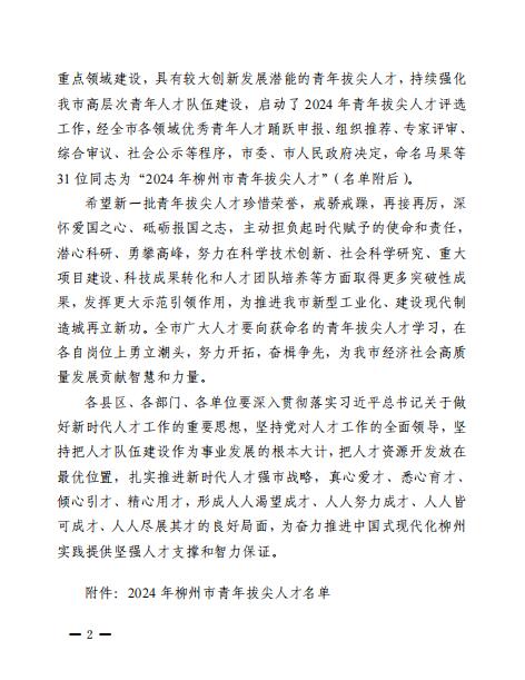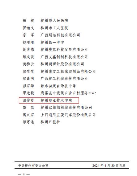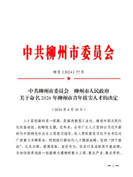 喜讯:米乐官网机电工程学院温俊霞博士被命名为“2024年柳州市青年拔尖人才” 来源: 发布时间:2024-05-15 17:45:28 浏览次数: 次 【字体:小 大】 新闻网消息(文、图/人事处 杨婉珍)近日,从中共柳州市委办公室《中共柳州市委员会 柳州市人民政府关于命名2024年柳州市青年拔尖人才的决定》(柳委〔2024〕77号)文件获悉,米乐官网机电工程学院温俊霞博士被命名为“2024年柳州市青年拔尖人才”。文件截图 部门网站审核:人事处(党委教师工作部、教职工发展中心)韩霄 终审:人事处 分享到: 【打印正文】