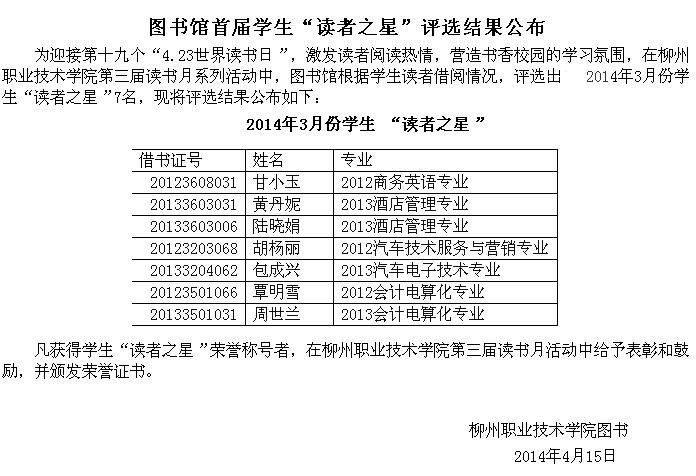 图书馆首届学生“读者之星”评选结果公布