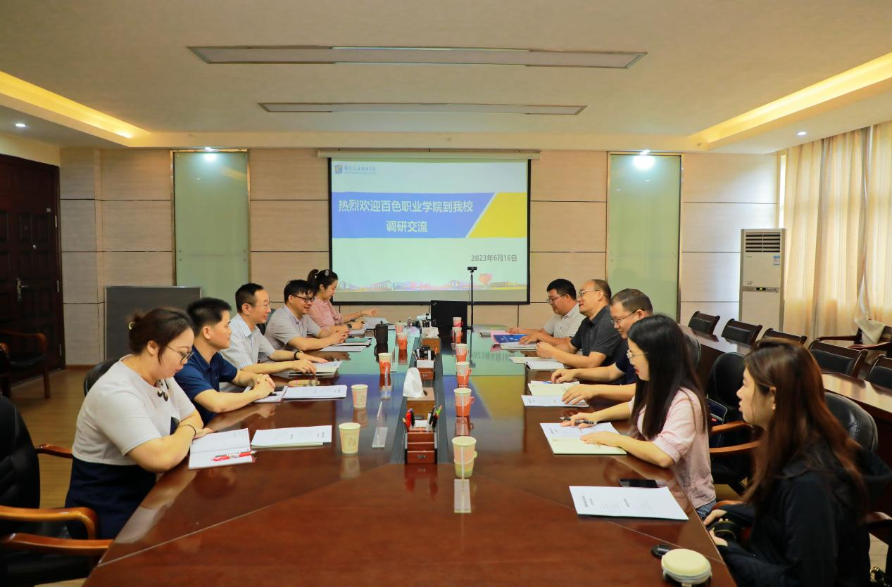 新闻网消息(文/党委宣传部 莫仁仁 图/党委宣传部 李卓)6月16日上午,百色职业学院副院长林灿东带队一行5人,到米乐官网社湾校区开展调研交流。米乐官网党委书记刘子林、总会计师冉福松、党委宣传部相关人员出席交流会并陪同参观。