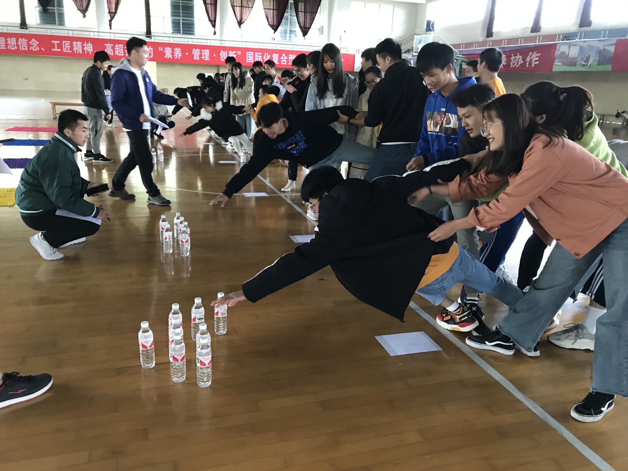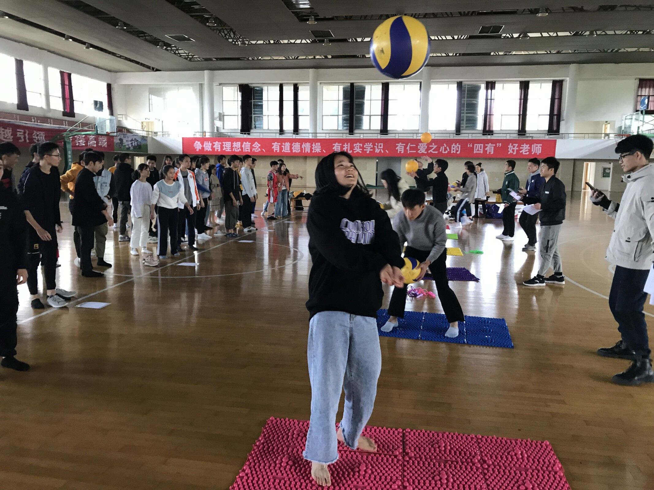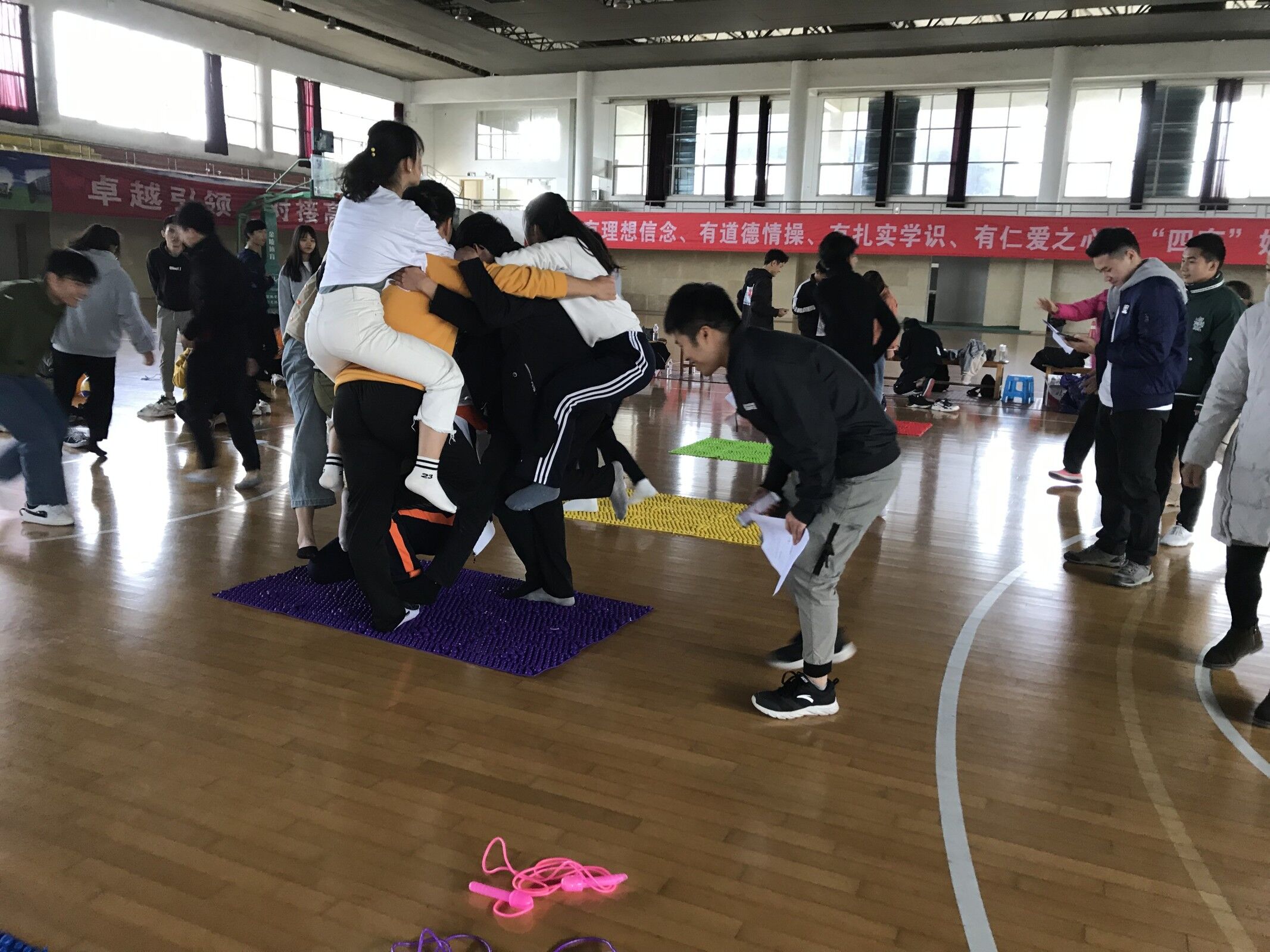 (文、图/学生工作处 郑柳萍)为进一步增强米乐官网综合服务中心队员们的团队协作能力,搭建彼此沟通交流平台, 11月29日下午1点30分,在学校体育馆四楼举办了两校区素质拓展活动。共有80多名值班员和老师参加了活动。