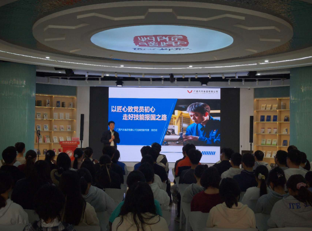 讲座中,郑志明以“以匠心致党员初心 走好技能报国之路”为核心,从广西汽车集团的发展历程切入,结合自身成长的三个阶段,为现场学子讲述了自己的技能报国之路。在“初心萌芽”阶段,他分享了初入职场时受老党员师傅言传身教,以及赵占魁、王进喜等劳模榜样的感召,树立起对职业的敬畏和对党的向往,最终在2004年光荣加入中国共产党的经历;在“岗位建功”阶段,他讲述了自己秉持“99.9% 就是不及格”的极致追求,练就手工锉削平面精度控制在0.002毫米以内的绝活,带领团队攻克多项技术难关,自主研发自动化环焊设备、减速器噪音检测设备,打破国外技术壁垒,还在疫情期间火速研发口罩生产线助力抗疫的攻坚故事;在“永葆本色”阶段,他谈及自己坚守党员初心,以“传帮带”培养多名技术能手,走进院校、社区开展技能培训和精神宣讲,让工匠精神薪火相传的责任与坚守。同时,郑志明还分享了作为党的二十大代表与习近平总书记交流的难忘经历,讲述了五菱从“引进模仿”到“赶超输出”的发展历程,让现场学子深刻感受到中国制造业的崛起和技能人才的时代价值。他寄语在场学子,报国从不是空洞的口号,而是藏在每一次精准的操作、每一次执着的创新中,新时代青年要坚定技能成才的信念,走好技能报国之路。