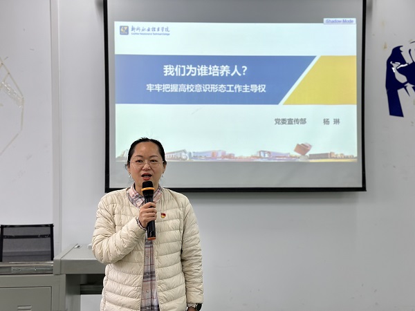 会上,杨琳强调高校是意识形态工作的重要领域,是意识形态工作的前沿阵地,高校教师要充分认识到意识形态工作的极端重要性。接着,她从党和国家、高校办学、党员干部和高校三个层面,对意识形态工作进行了深入解读,并指出意识形态工作要从课堂教育教学管理、宣传思想阵地管理、网络意识形态管理、有关项目资金管理、人员管理、各类社团管理、抵御和防范邪教渗透、师生思想政治工作等方面进行加强,同时通过分析一些具体案例中存在的意识形态问题,告诫大家要坚决抵制和清除各种错误思潮和言论的影响,营造风清气正的校园文化氛围。